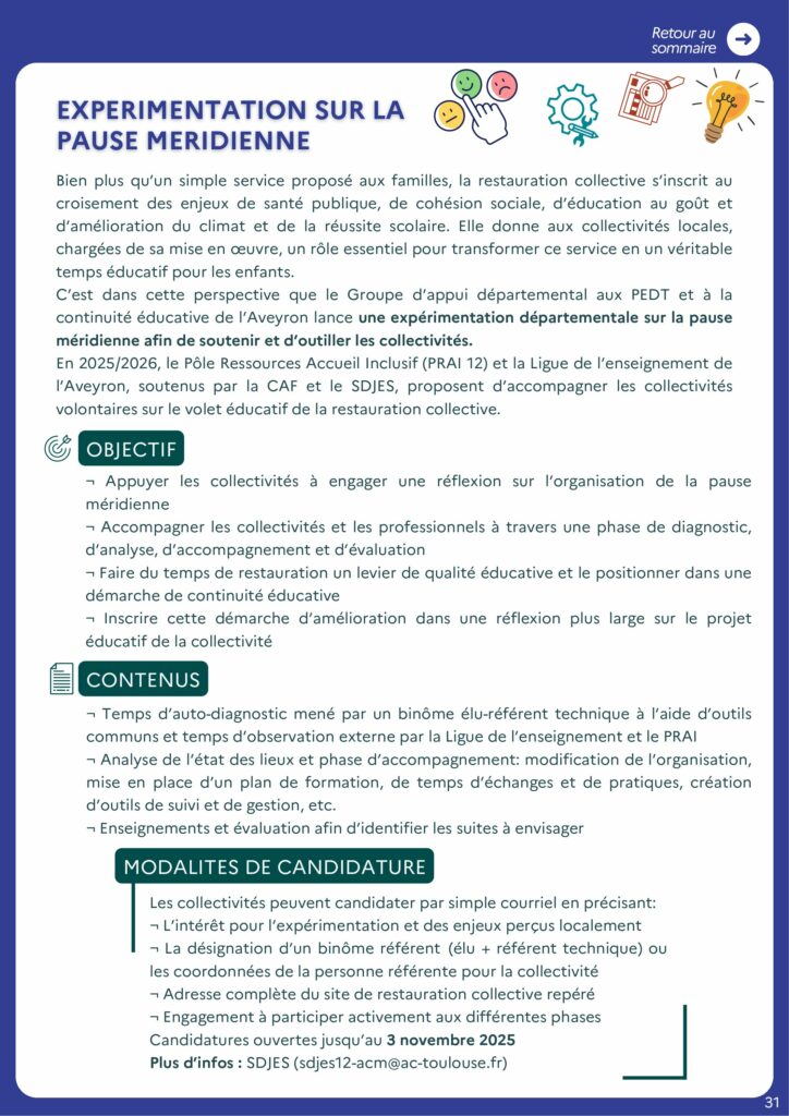 La Sdjes et la Caf de l’Aveyron avec la ligue de l’enseignement et le PRAI 12 propose aux collectivités volontaires un accompagnement dans l’évaluation de la pause méridienne.